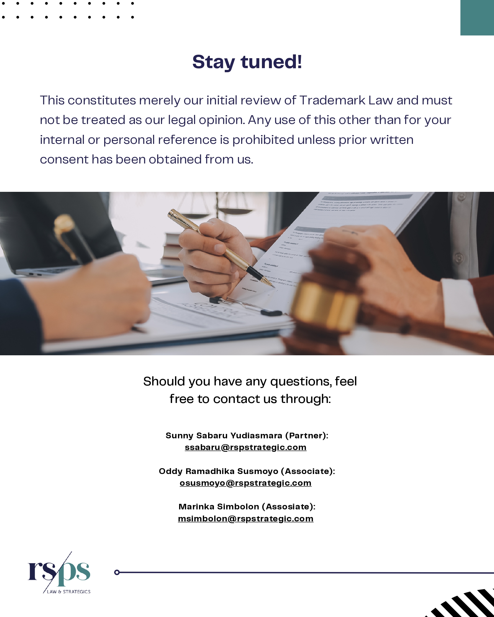 Underpinned by our core principles, Reisman Sabaru & Partners Strategic (RSPS) is committed to add values to clients by delivering responsive, holistic, strategic legal services.